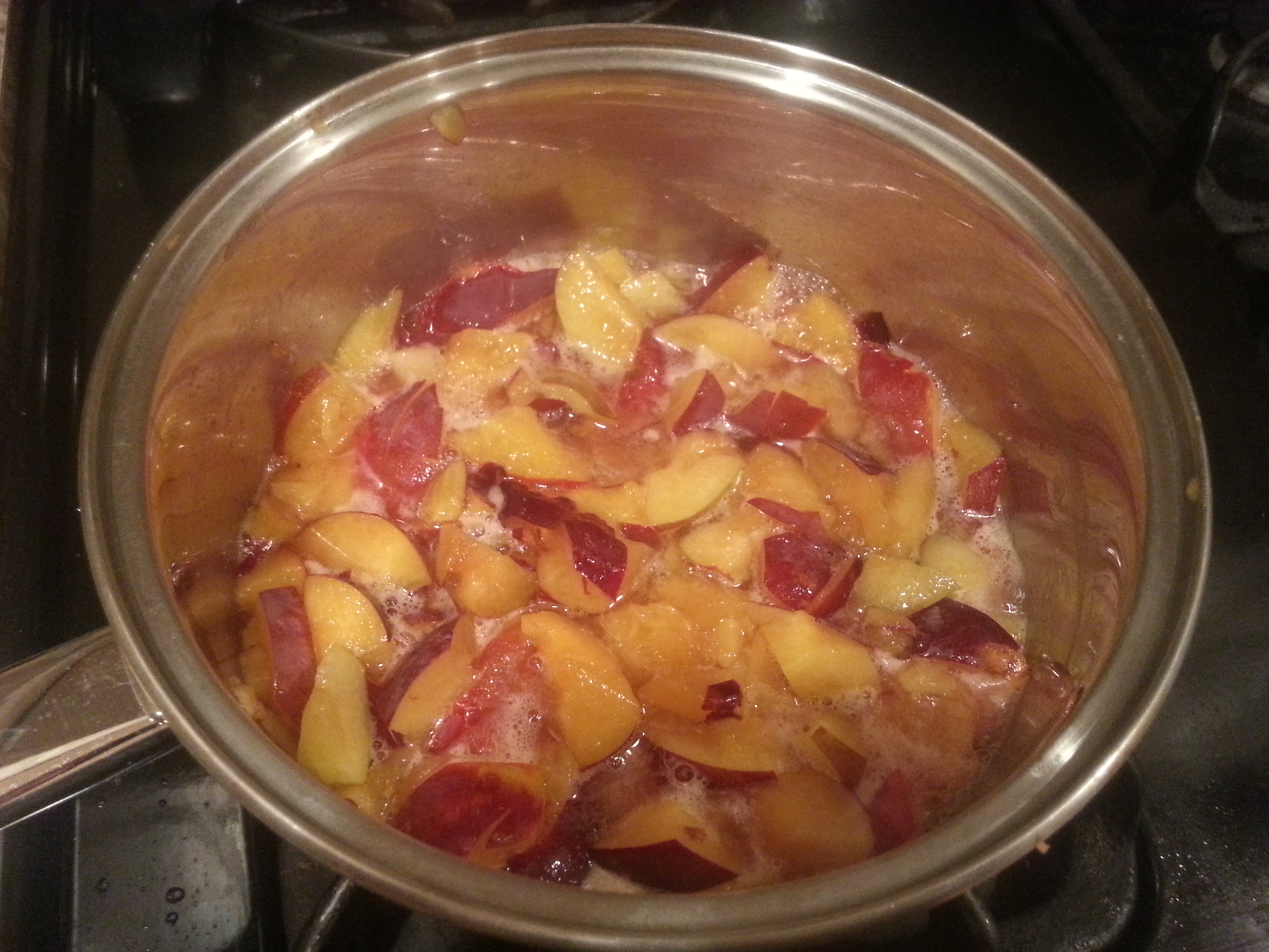 The remaining apples and pears had some serious holes and bruises, and the plums were so ripe they were dissolving into my table as tried to figure out what to do with them. I’d never made preserves before, but I decided to take a stab. After some over-the-phone reassurance from my mother that I’ve eaten unprocessed jam my whole life and am no worse for wear, I sealed the preserves hot in sterilized old jam jars rather than processing them in the canner.