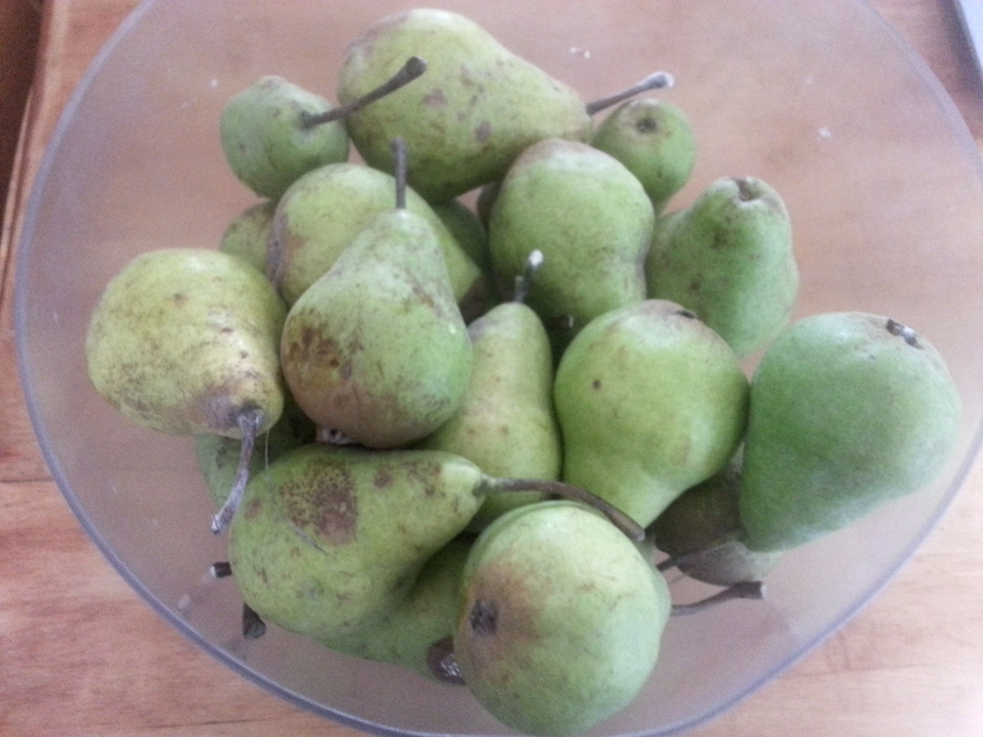 I was saved by the fact that a lot of the pears weren’t completely ripe yet. I was… reasonably confident that they and the unbruised apples would last a week. But where to keep them? The house was hot, the refrigerator was at capacity, and I still hadn’t recovered from discovering my cellar mangoes full of little rodent toothmarks. Rationalizing that they were free anyway, I sealed them in a five gallon bucket in the cellar and tried not to think any more about it.