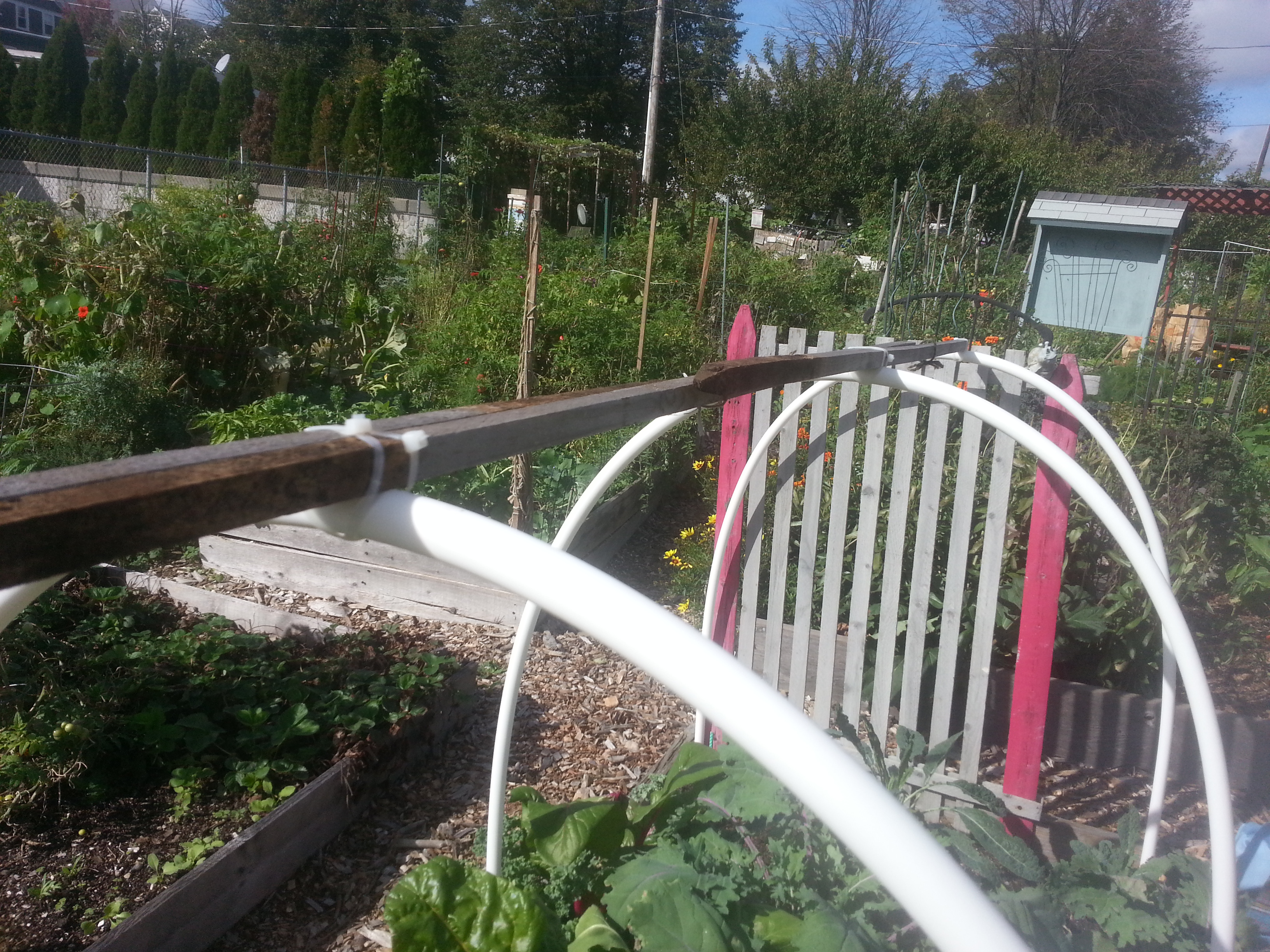 Construction was a breeze. My plot is roughly ten feet by three feet. We bought four ten-foot lengths of PEX tubing and sunk them deep into the soil. This made a tunnel just high enough to cover everybody. The trellis didn’t make the cut, but the cucumbers and melons on it had all but given up for the season, anyway. It was a mercy killing.
