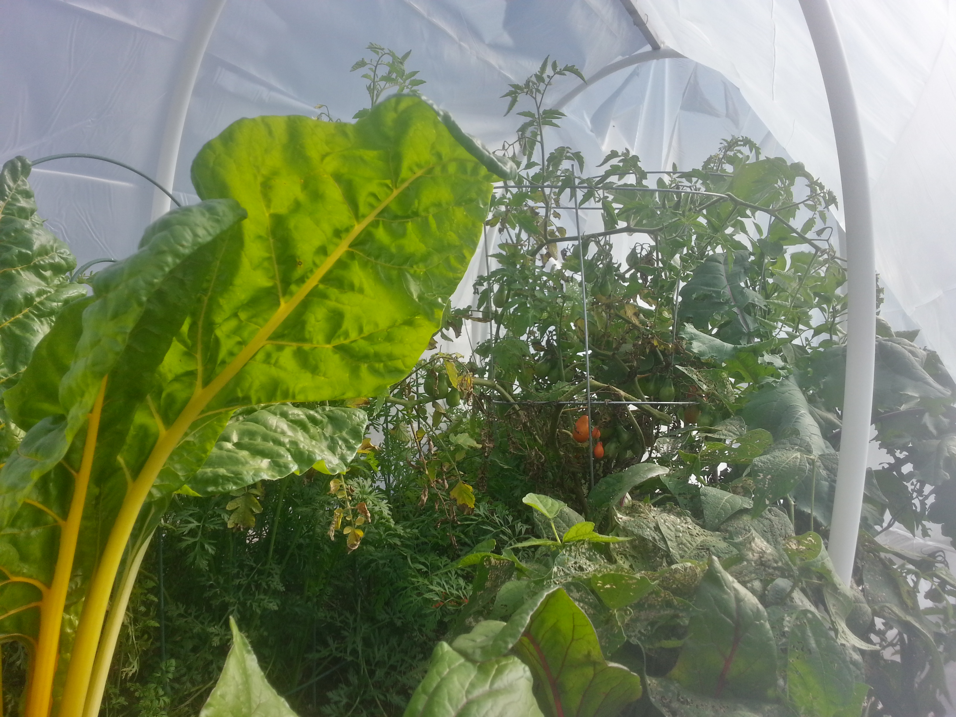 I’m expecting the eggplants, peppers, tomatoes, and squash to give up the ghost eventually. The days are going to get too short and the bees are going to go into hiding, and any tomatoes I eat in January will come from California. For the leaves and roots, however, I have high hopes! With some mulching, and maybe a flap cut into the roof in preparation for access through the many feet of inevitable snow, there’s a chance I could be eating fresh vegetables on Valentine’s Day.