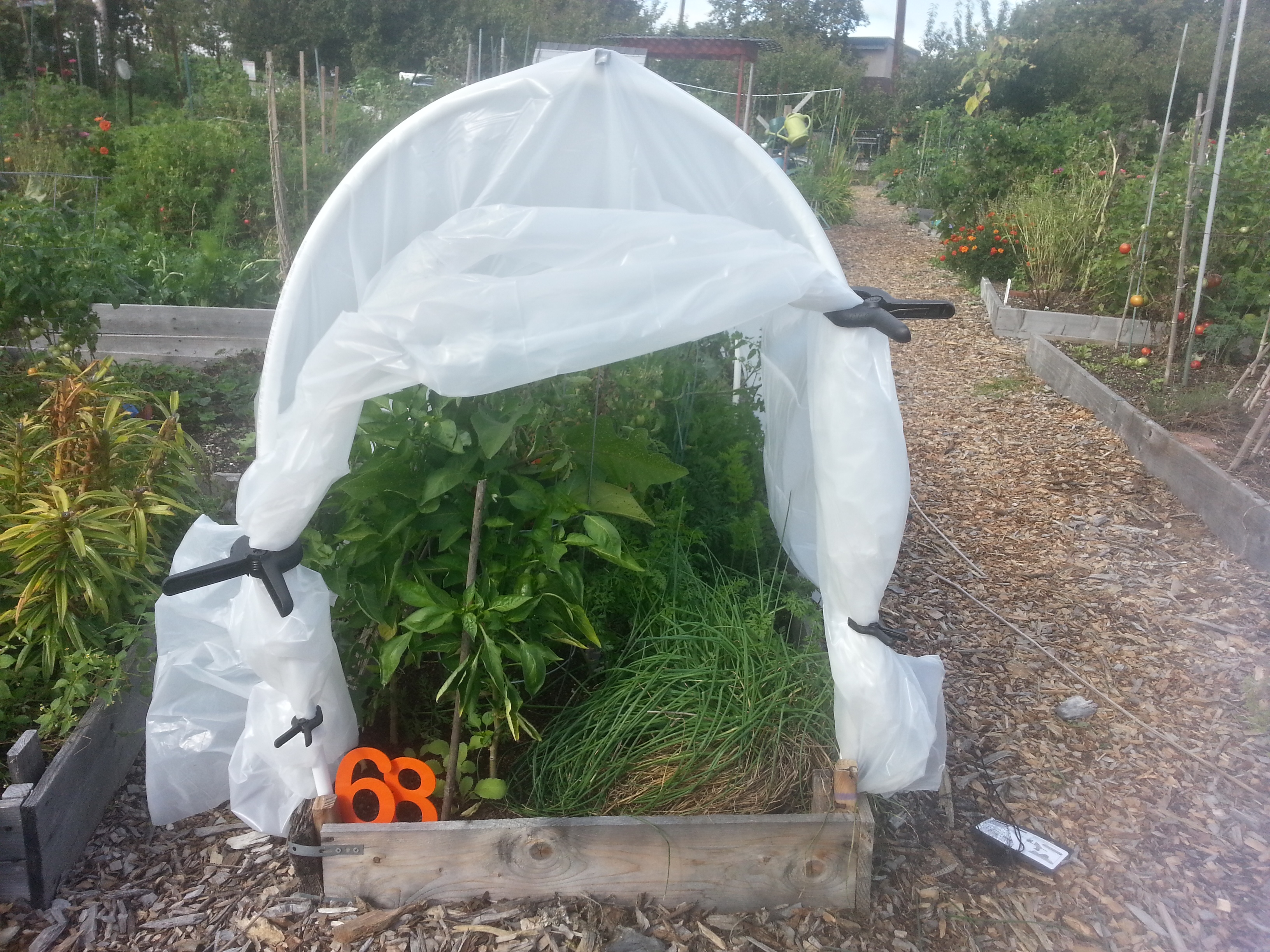 Since it’s still warm out, I’m leaving the ends perpetually rolled up, and I’m treating the hoop house mainly as surprise frost protection. Once the temperatures start dipping lower, I’ll have to roll the ends down at night and up in the morning. With any luck, this will keep the warm weather guys alive long past their unprotected neighbors. With even more luck, pollinators will be able to find their way into and out of this thing.