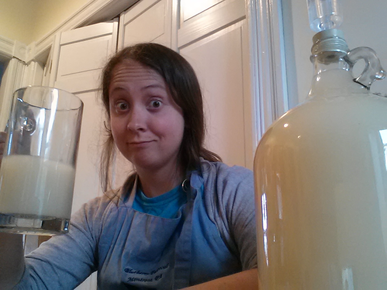 Last but not least, I racked the rhubarb out of that horrible Mr. Beer keg which, to its credit, did not leak out of any new places. I was right in resigning myself to no healthy pink blush. I wasn’t anticipating this color, though, which unkind critics might call “dishwater” but I’m choosing to call “pearl.” I’m really curious to see if it settles over time into something transparent.