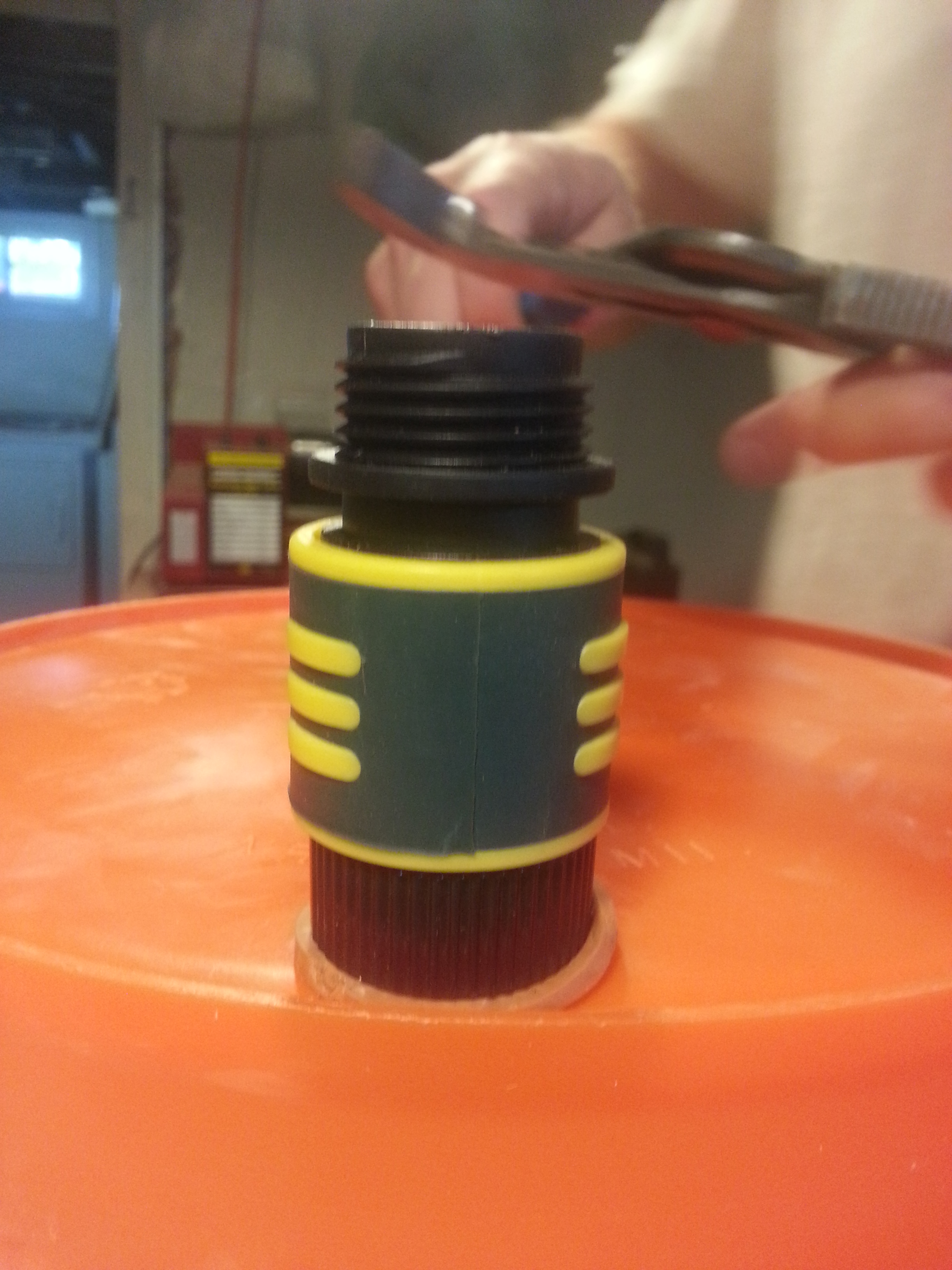 Here’s a layout of the equipment as suggested by Ben, who’s a little more orderly than I am. We bought a 25-foot permeable hose that’s designed for slow-release, long distance watering. We also got two connectors that would thread into each other, and a bunch of rubber washers. Basically, we needed to create a tightly sealed passage through a hole in the bottom of the bucket leading into the hose. We just winged it in the garden hose section, but if you’re looking to have an easier time, this would probably do it.