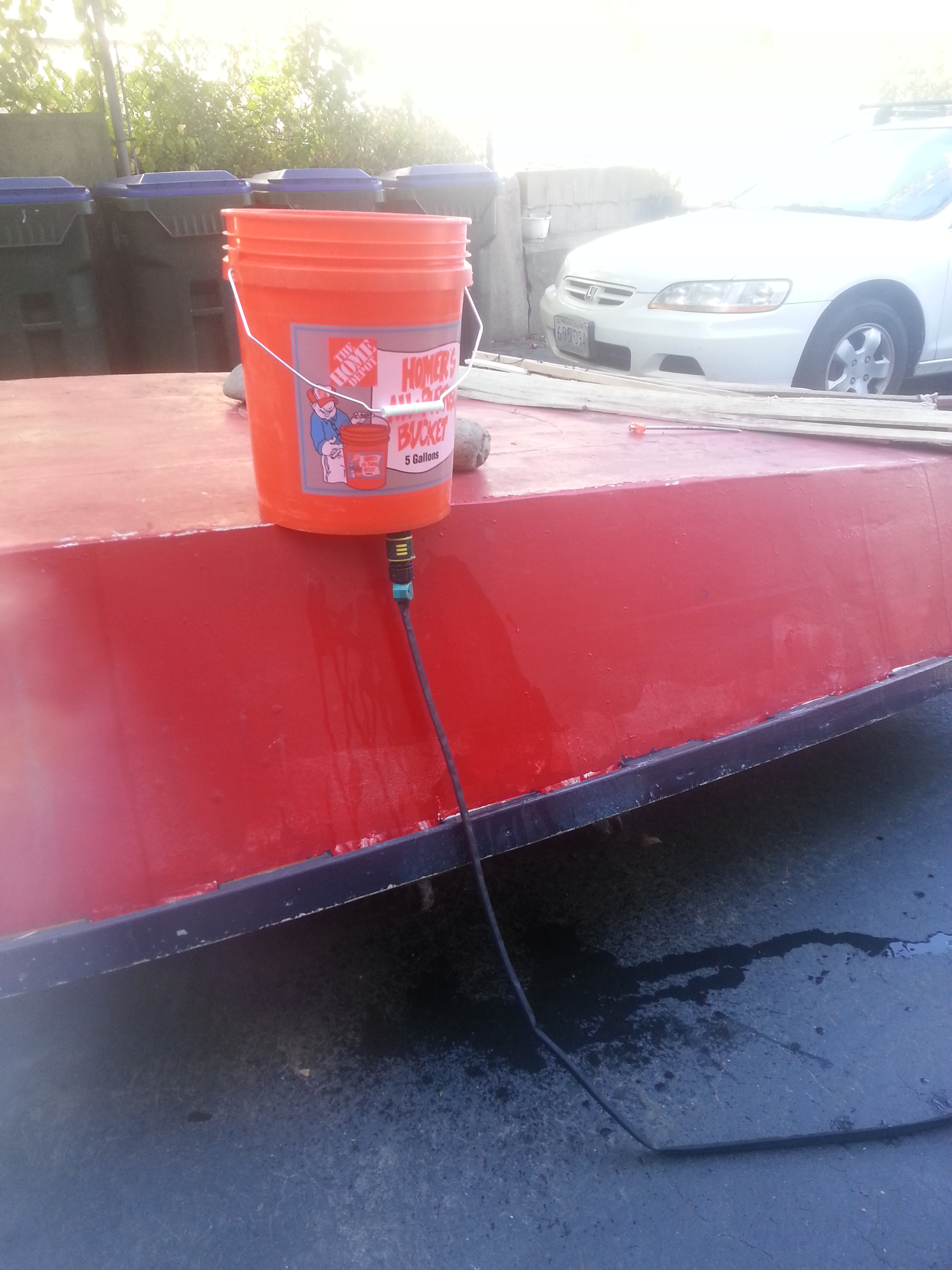 We drilled a hole through the bottom of the bucket and pushed one connector through with a washer attached, creating a seal inside the bucket. Another washer went on the outside, which you can see here.