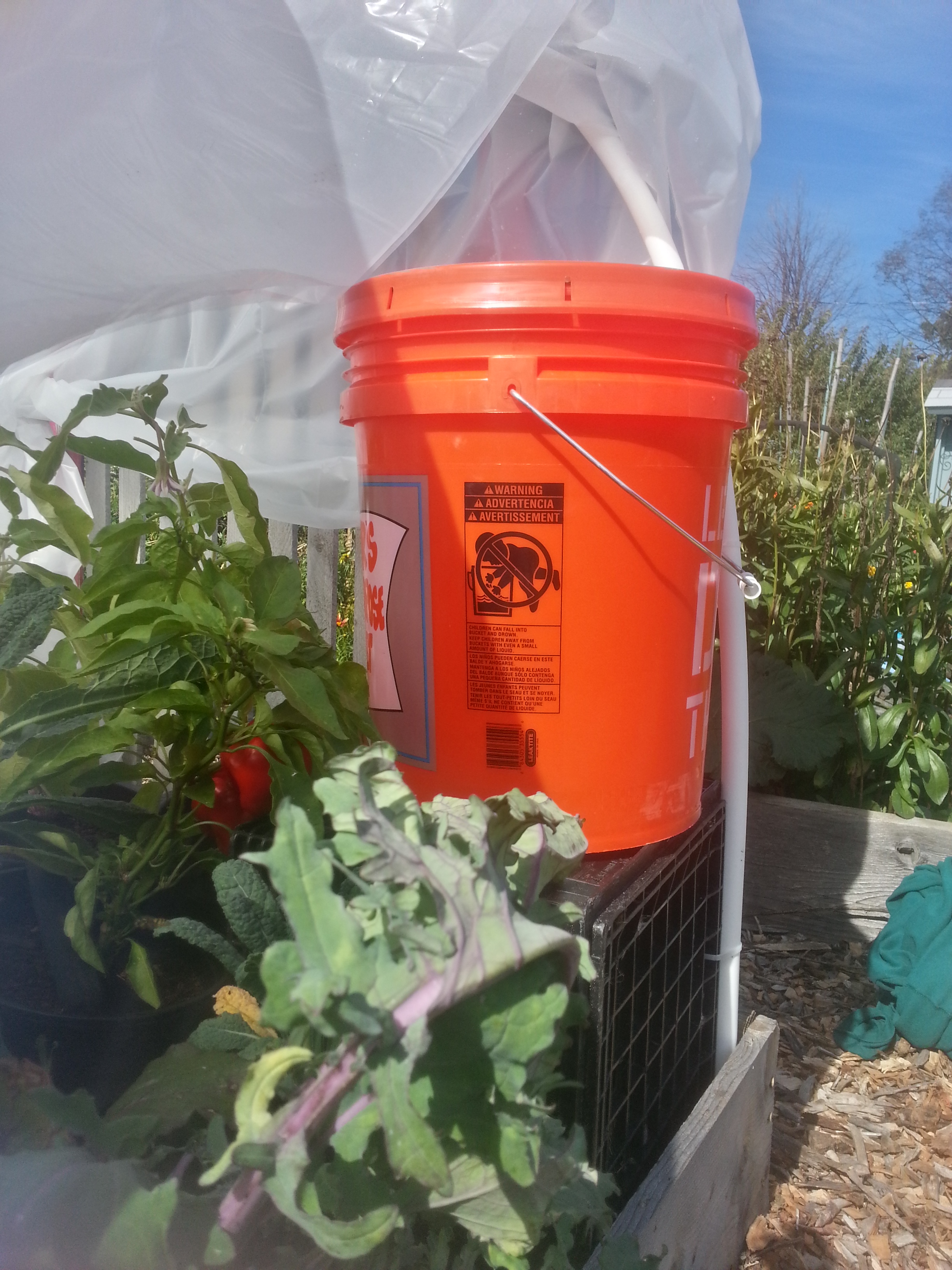 Once we were convinced no water was escaping, we installed the whole thing in the hoop house. We fit the bucket just inside the tent in the hope that the water won’t freeze as quickly this way. We perched it on a milk crate so gravity will build up some pressure. That’s my biggest concern: Will lifting the water a foot off the ground be enough to push it to the plants that are 25 feet away?
