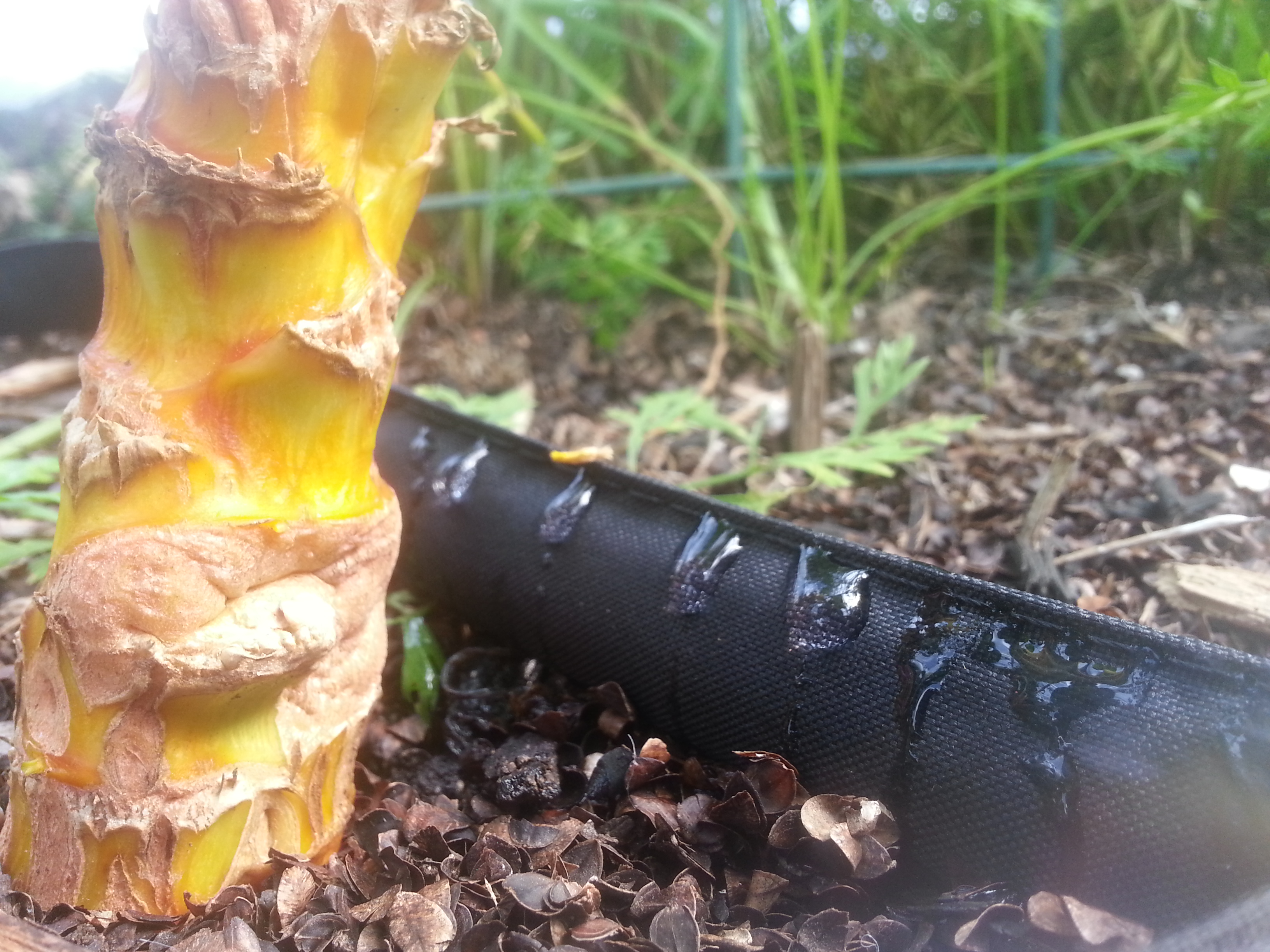 This hose truly is slow release. It seems to be full of water and ever-so-slowly beading it out. To human me, this seems like an unconscionably hard way to get a drink. But to the plants, this might be just fine, and preferable to waiting for me to get around to watering them.